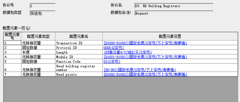 【Head Holding Register Number】:读从站寄存器的起始地址;若需要读取的MW1000内容,则设置该项的寄存器“D0”的内容为1000;