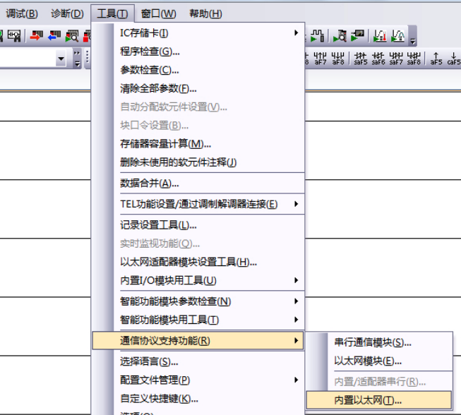 通过内置以太网“打开设置”,配置通讯协议,打开方式,TCP连接方式,IP地址,主从站端口号,控制寄存器的起始地址