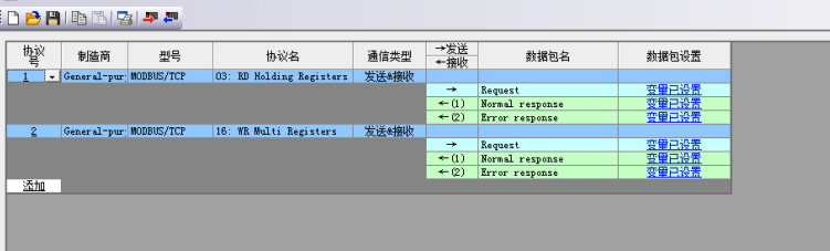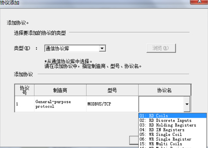 b) 点击【添加】,选择Modbus TCP,选择相应的功能码。